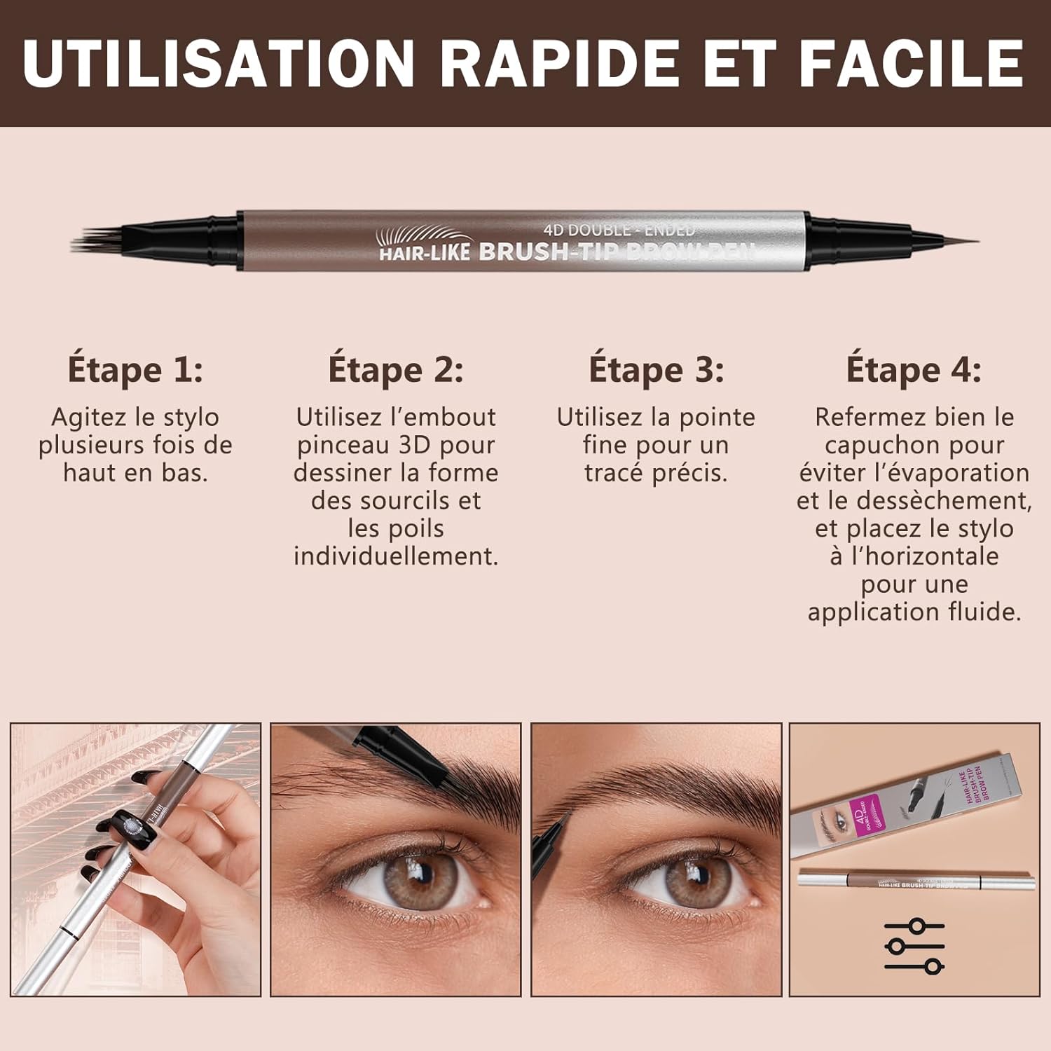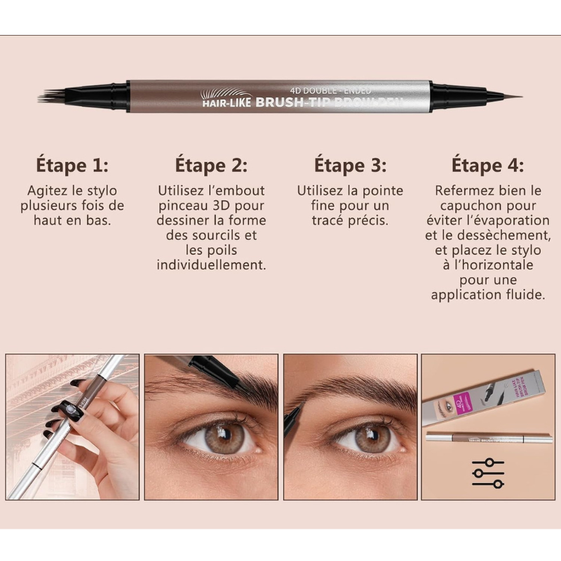 L’applicateur multiblading crée des lignes micro-fines ressemblant à des cheveux en un seul passage et comble les zones éparses. L’applicateur pointe fine crée une illusion de vrais sourcils naturels.